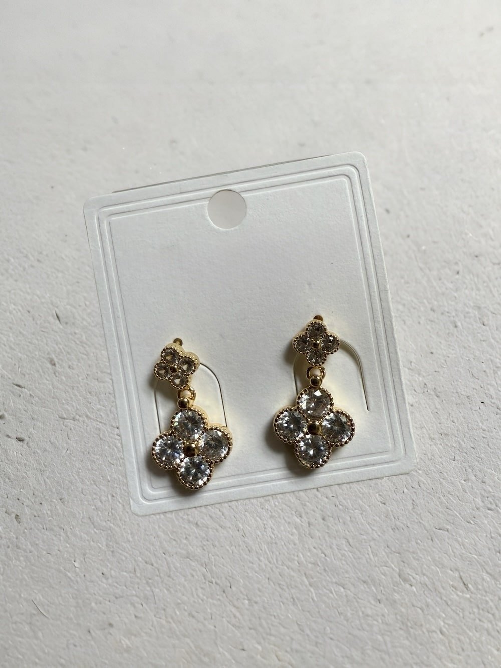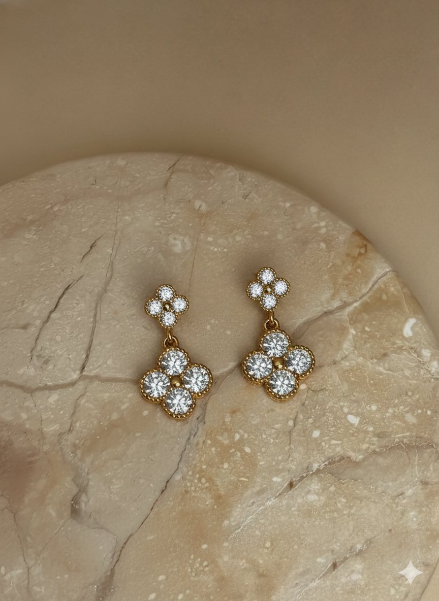 Bonita Bonita a sweet and playful Colombian expression used to compliment someone in the most affectionate way. These earrings feature a delicate floral silhouette made of sparkling cubic zirconia, framed in 24K gold-plated brass for a luminous, elegant finish.