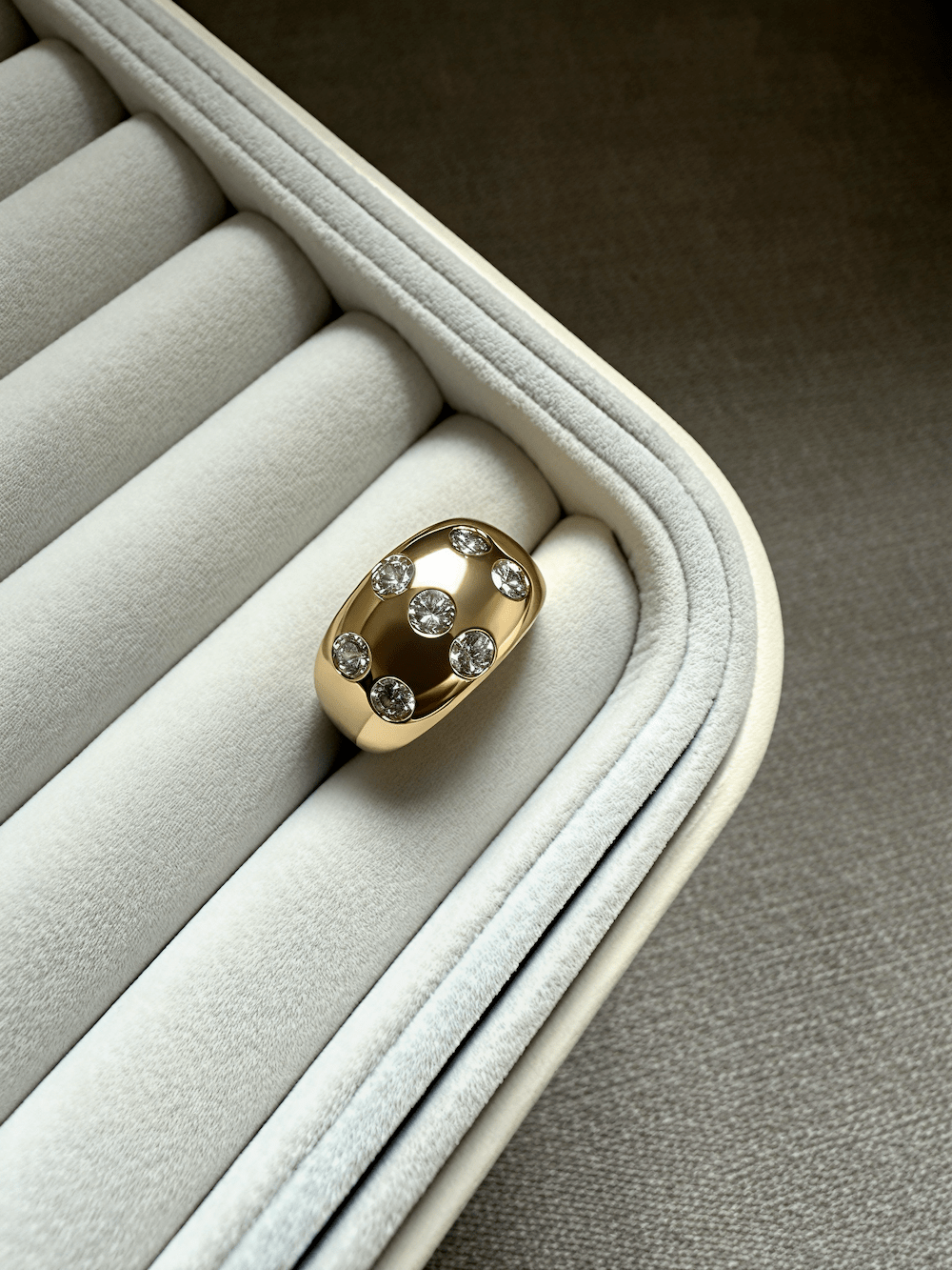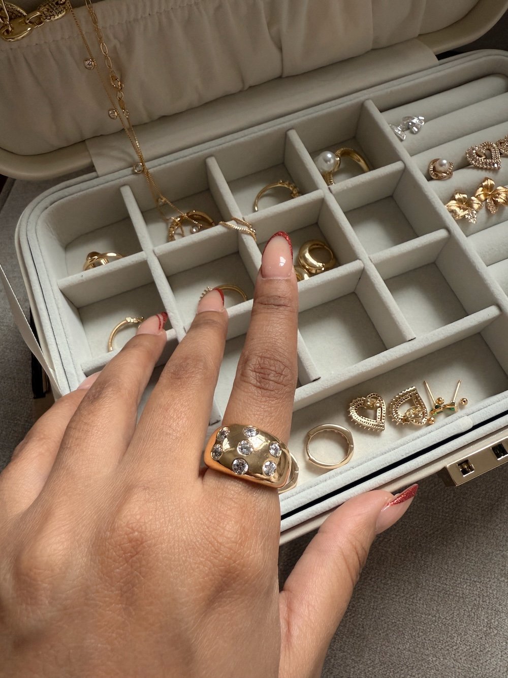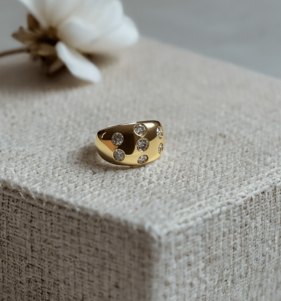 Crafted in high-quality brass with 24k gold plating, its bold, rounded band is adorned with scattered cubic zirconia that shine like stars reflected on water. Each stone is precisely set to catch the light at every angle, giving the piece a radiant and luxurious finish.