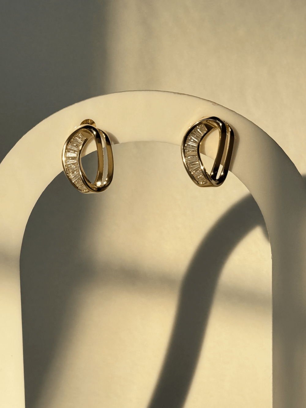 A bold yet graceful twist on classic elegance. These earrings capture the glint of sunlight through crystalline arches, merging timeless gold with radiant zirconias in a design that whispers modern luxury.