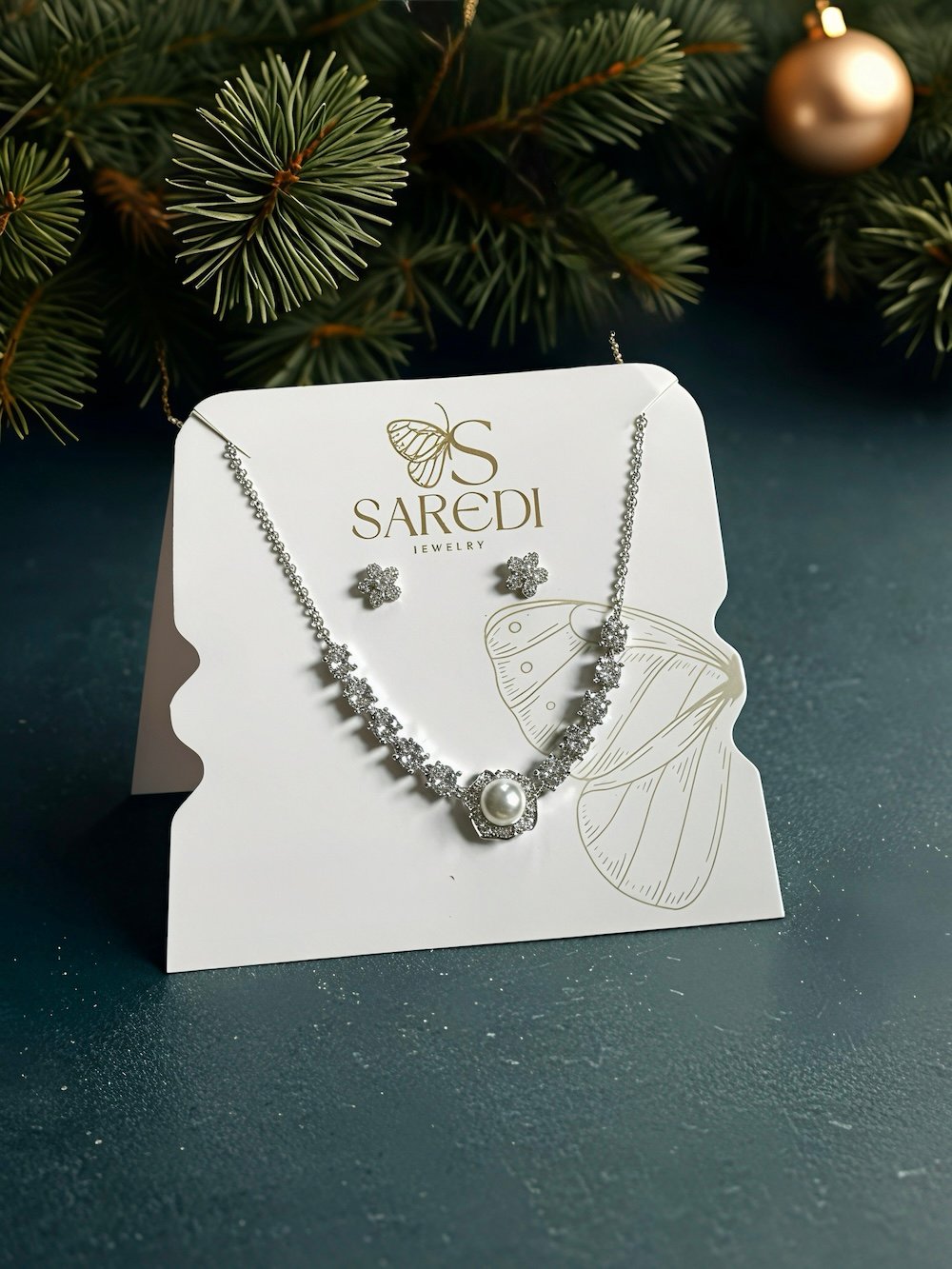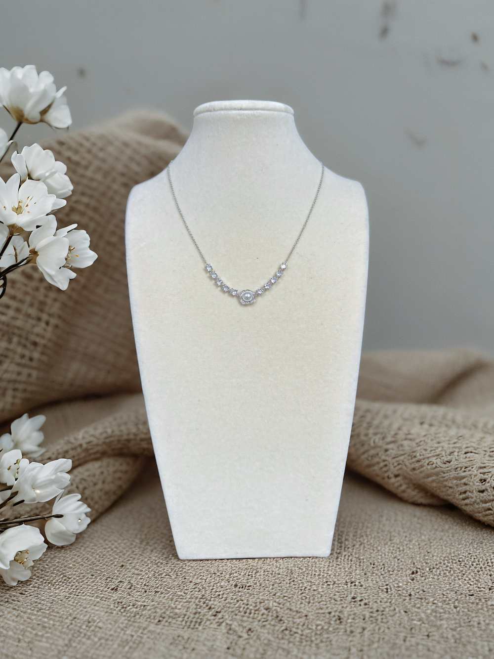 This elegant set includes a necklace and stud earrings crafted in high-quality brass with rhodium plating, giving it a long-lasting shine and a luxe silver tone.